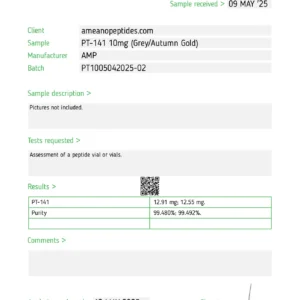 PT-141 (Bremelanotide) 10 mg is a ≥ 99 % pure melanocortin-receptor peptide supplied as a lyophilized powder for in-vitro MC3R / MC4R signaling research. For laboratory use only—no human or veterinary applications.